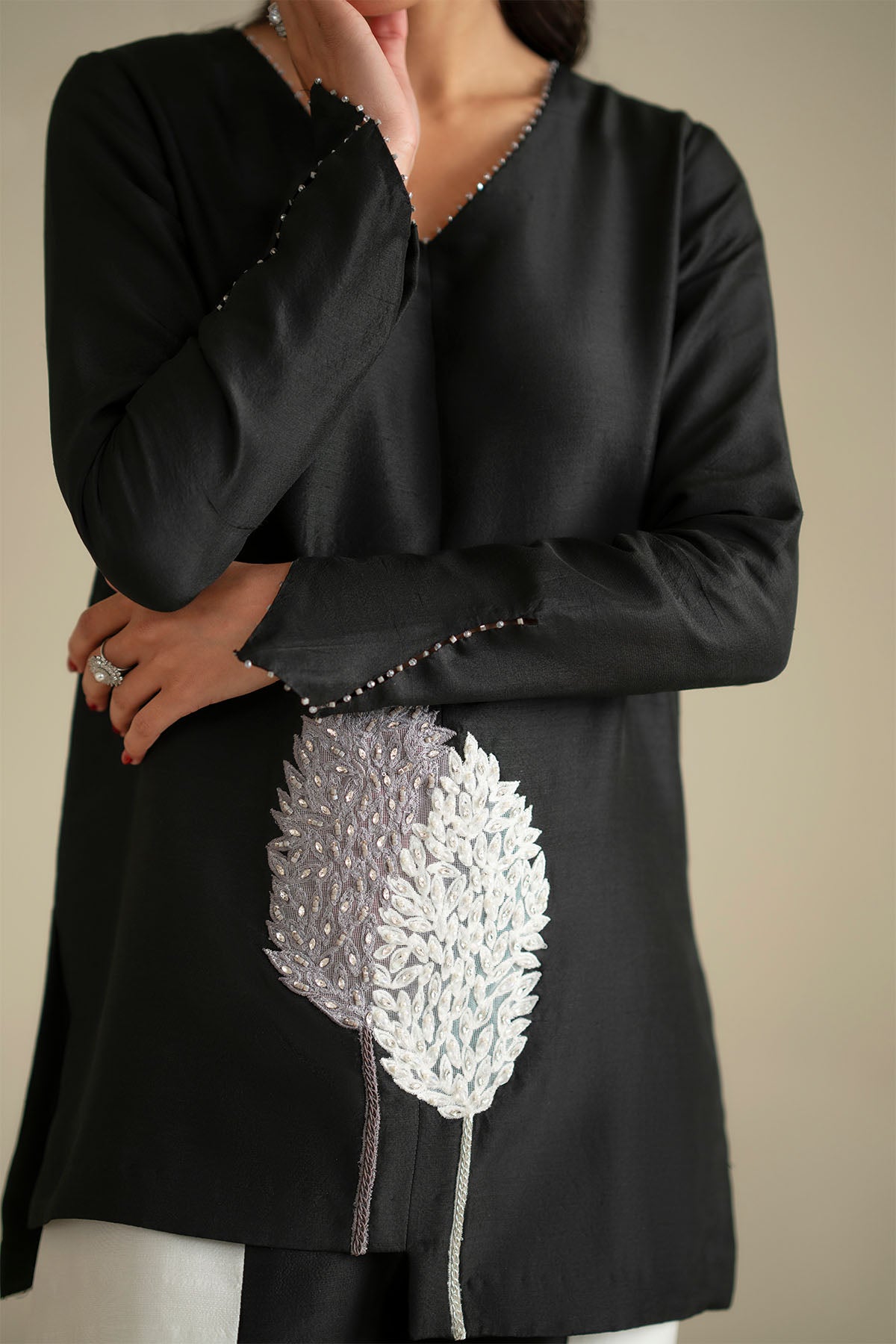 The jacket stands out with intricate patchwork and hand embellishments, creating a modern, architectural silhouette.
