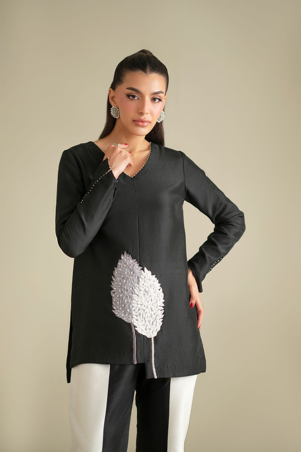 Paired with double-tone panel trousers, this look blends sharp tailoring with artisanal detail for a striking contemporary statement.